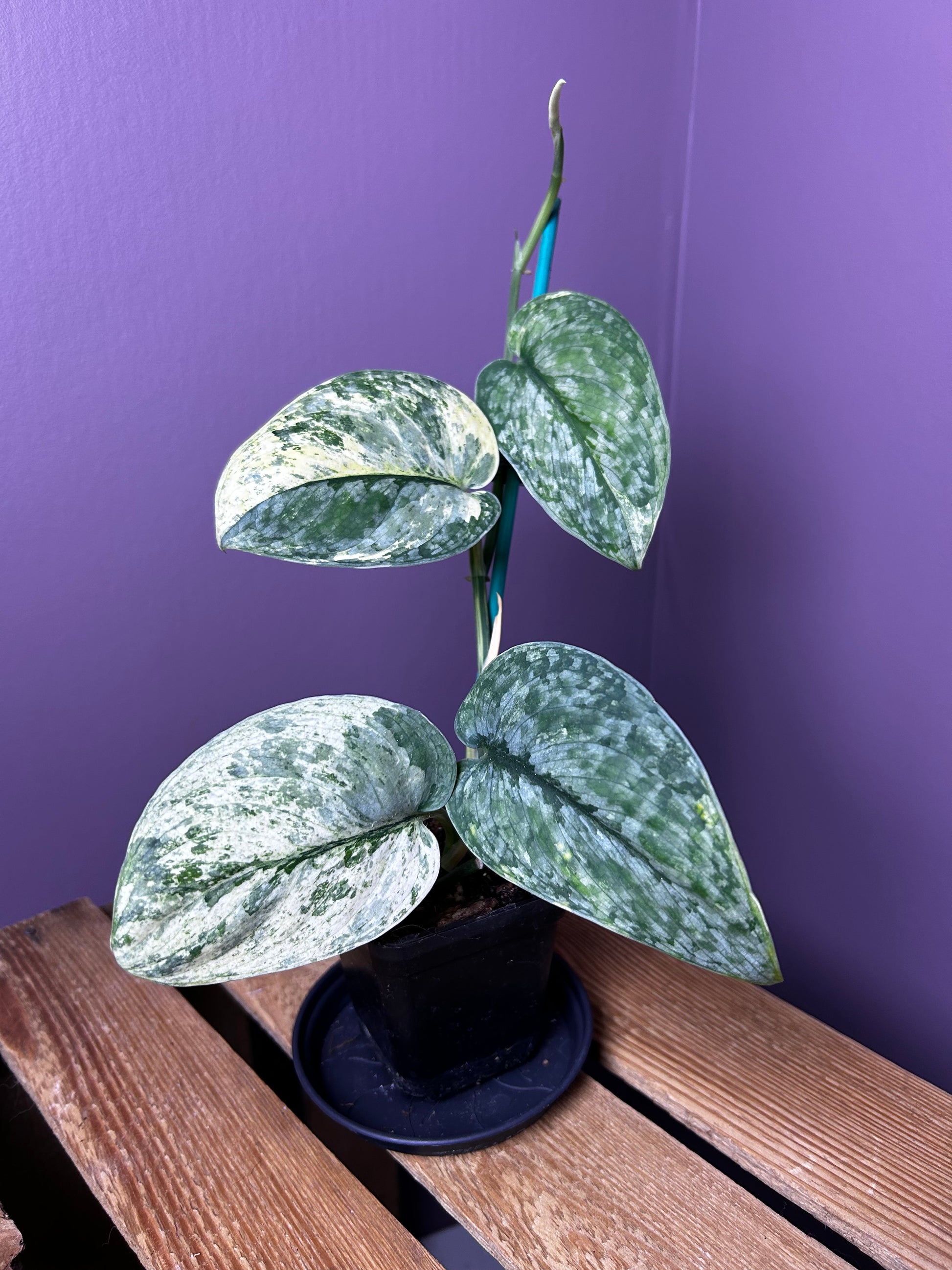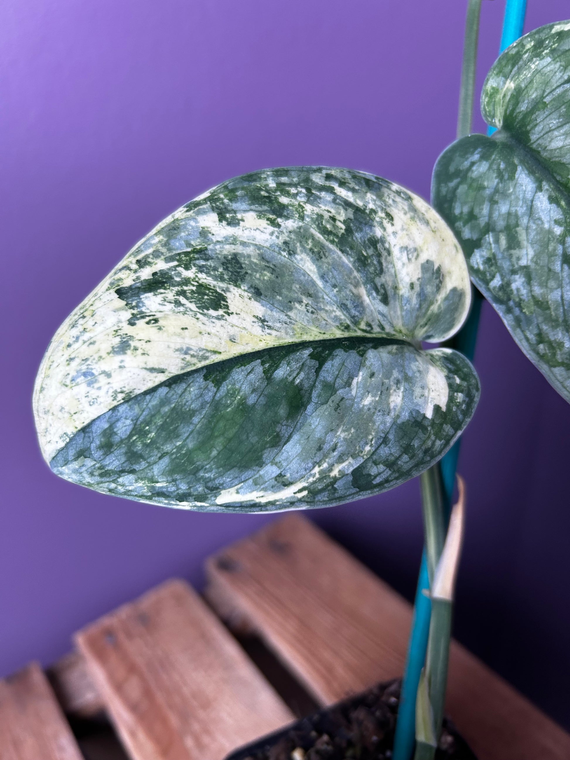 Highly variegated plant also known as Silver Cloud variegata. This plant has a silvery-green patterned base with white/yellow variegation. The closer you look, the more details you will find in these stunning leaves!